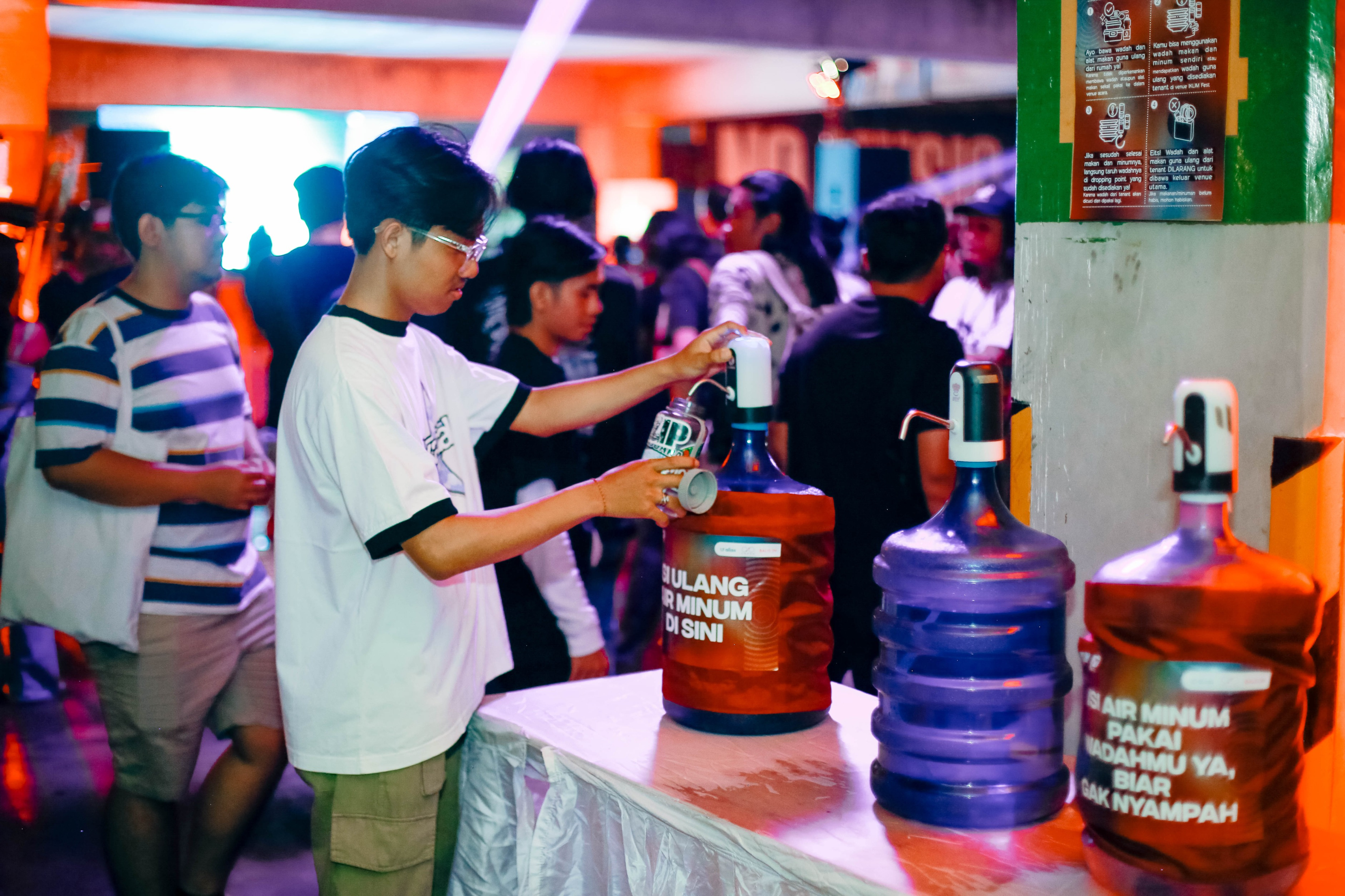 Dalam arena utama tersebut terdapat galon-galon air mineral di beberapa titik yang digunakan untuk isi ulang minuman. Tenant makanan yang berjualan pun bebas dari kemasan plastik sekali pakai. Mereka bekerja sama dengan unit usaha seperti Taksu, Alas, dan Balikin yang menyediakan alat makan guna ulang. Apapun pilihan makanannya, selalu ada alat makannya karena beneran selengkap itu. Ada sendok, garpu, piring, mangkok, gelas, dan cangkir. Susah nggak sih bikin festival musik dengan konsep begini?